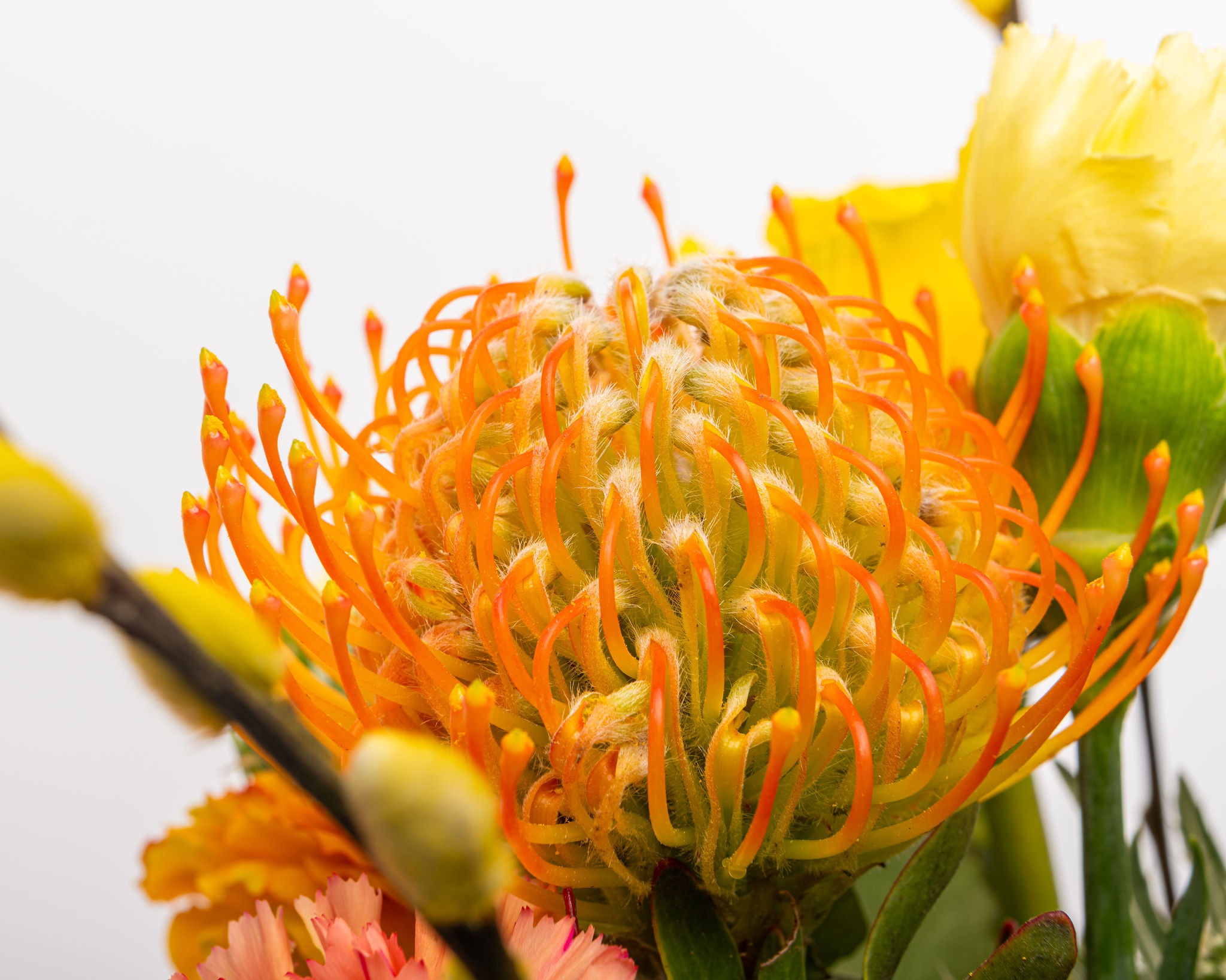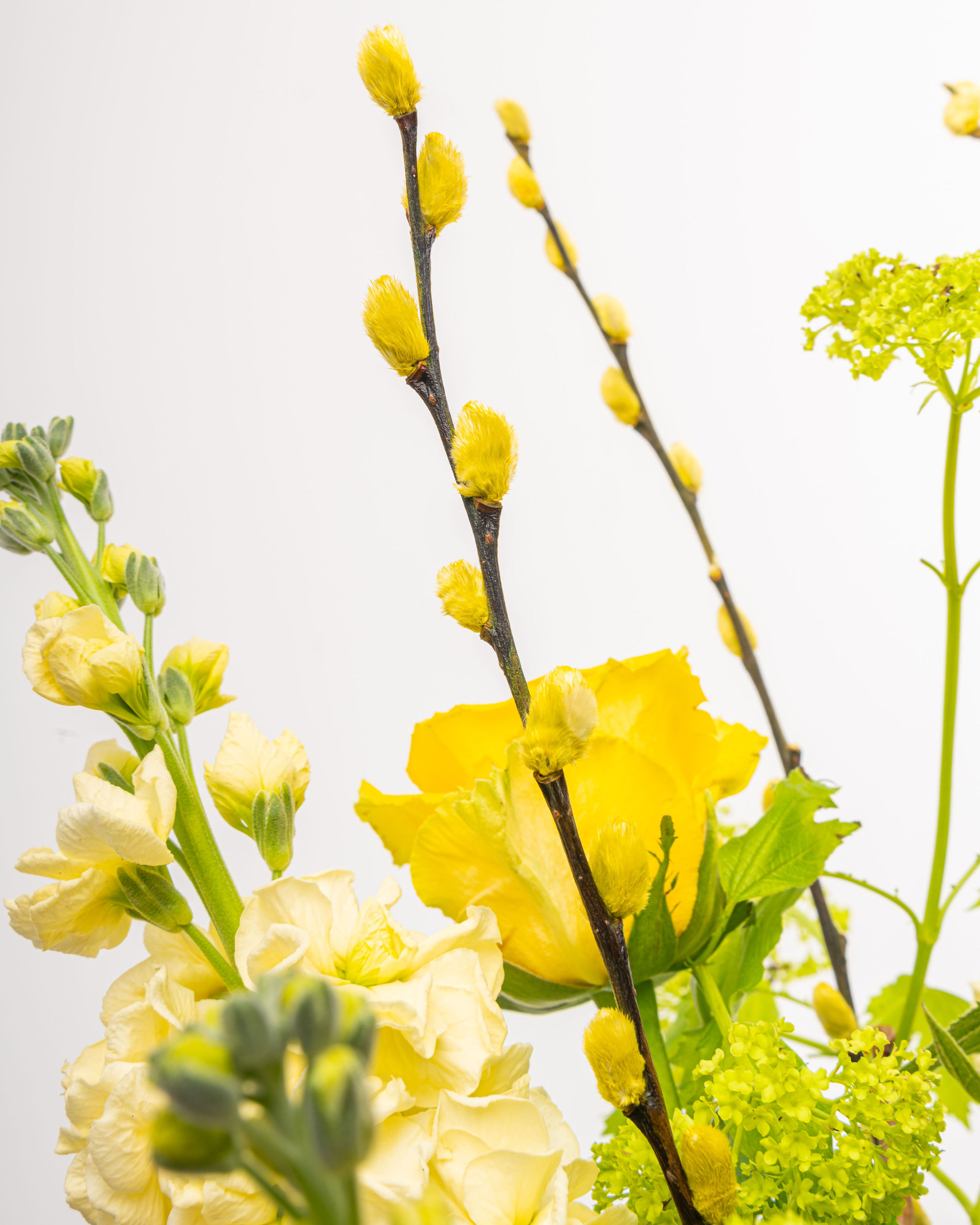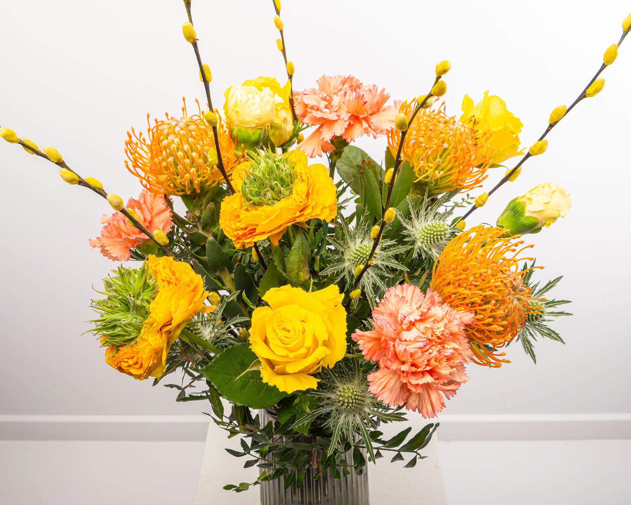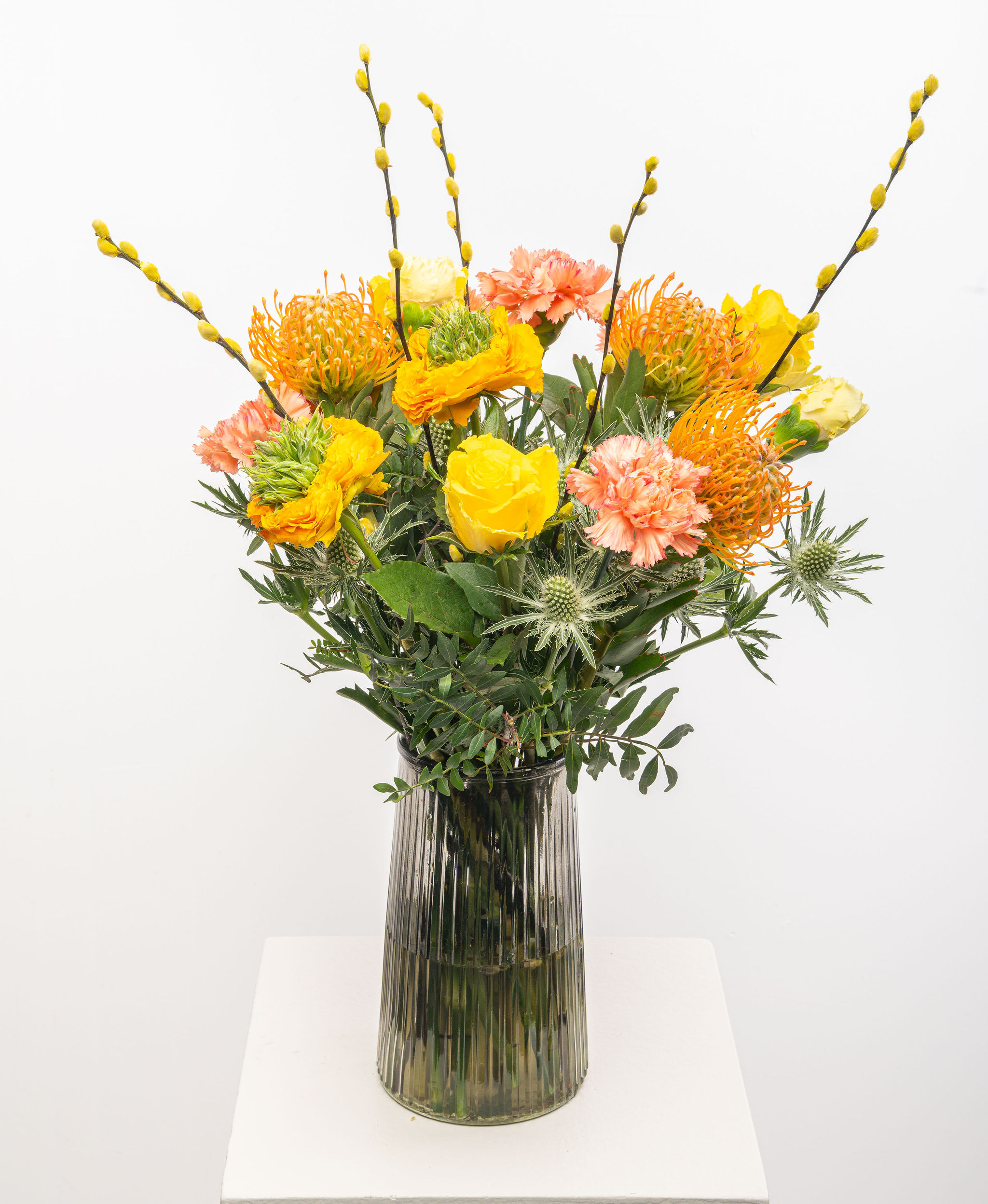 Dit charmante boeket in geel en oranje wordt gekenmerkt door een mix van levendige bloemen, waaronder de sierlijke Nutan bloemen. De warme tinten brengen een gevoel van vreugde en warmte, terwijl het geheel wordt gebalanceerd door het frisse groen van het blad. Het boeket straalt een natuurlijke en vrolijke uitstraling uit, perfect om een vleugje kleur en gezelligheid toe te voegen aan elke ruimte.